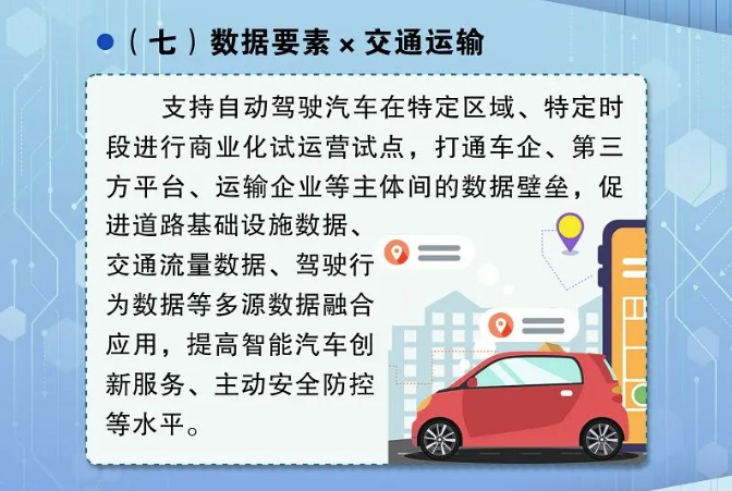 《“數(shù)據(jù)要素x"三年行動計劃(2024-2026年) 》提出,推進(jìn)智能網(wǎng)聯(lián)汽車創(chuàng)新發(fā)展,支持自動駕駛汽車在特定區(qū)域、特定時段進(jìn)行商業(yè)化試運(yùn)營試點(diǎn),打通車企、第三方平臺、運(yùn)輸企業(yè)等主體間的數(shù)據(jù)壁壘,促進(jìn)道路基礎(chǔ)設(shè)施數(shù)據(jù)、交通流量數(shù)據(jù)、駕駛行為數(shù)據(jù)等多源數(shù)據(jù)融合應(yīng)用,提高智能汽車創(chuàng)新服務(wù)、主動安全防控等水平。